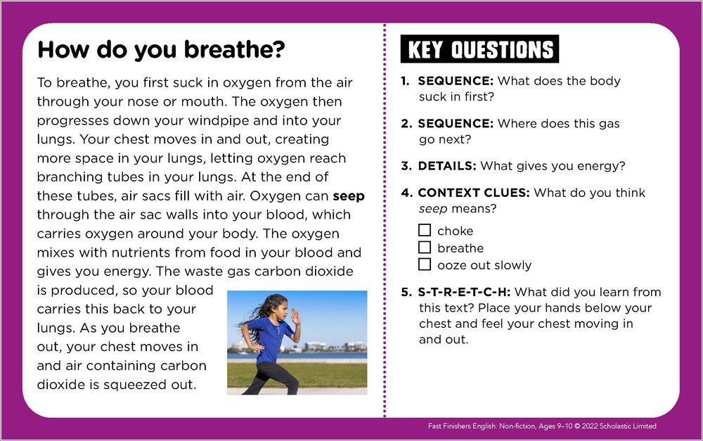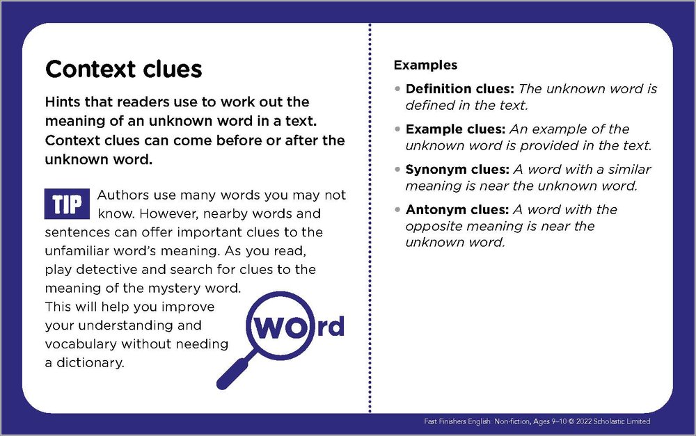 - Comprehension-helper cards that provide kid-friendly definitions, tips, and examples to help students master reading skills