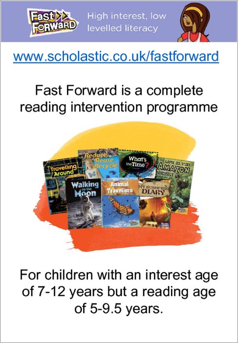 Fast Forward books are designed for striving readers with an interest level of ages 7-12 but with a reading age of 5-9.5 years. To ensure that children are given every opportunity to succeed in their reading, the introduction of new words is one new word for every 16 known words (1:16). Unlike levelled reading programmes for younger children, Fast Forward introduces more complex sentences at the earliest levels. This series contains both instructional and independent texts. The core instructional texts are designed for teacher-led guided or shared reading sessions and have audio recordings available to download from the scholastic website, and have an associated Teacher’s Guide. The independent texts are carefully levelled for independent reading to help build reading confidence.