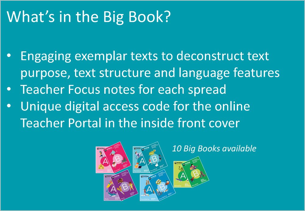 Included inside the Big Book is your own unique digital code to give access to the online Teacher Portal, a comprehensive suite of teacher resources, providing full support for the exploration and development of writing skills for ‘Early’ stage students.