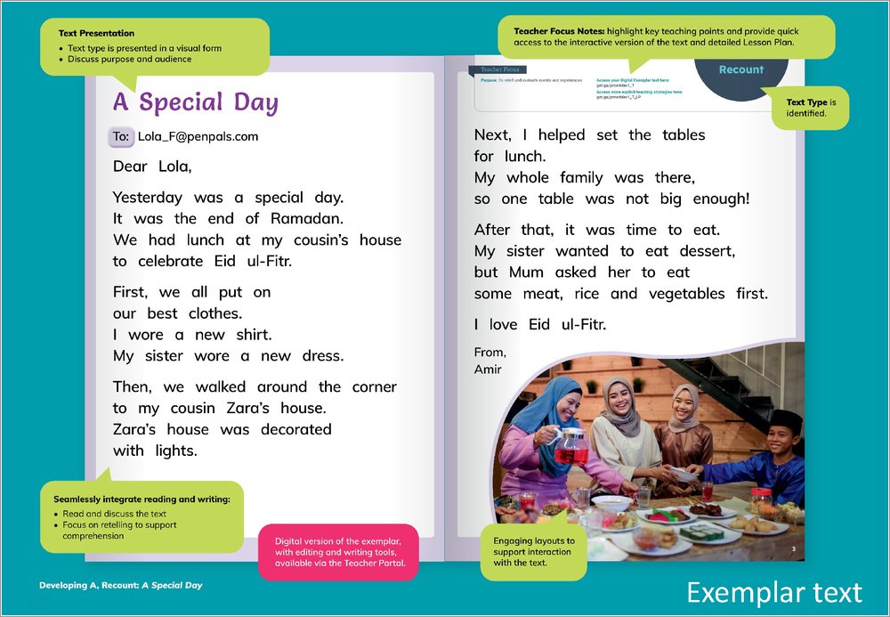 - Engaging exemplar texts to deconstruct text purpose, text structure and language features.