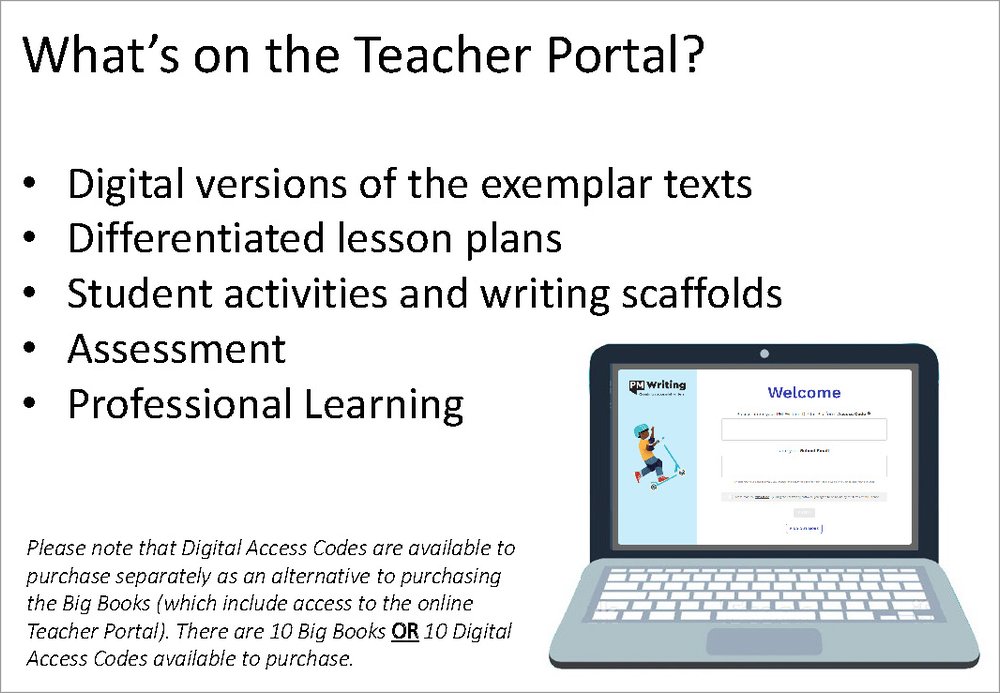- Access the PM Writing Teacher Portal for Developing A texts with the unique code on the inside front cover.