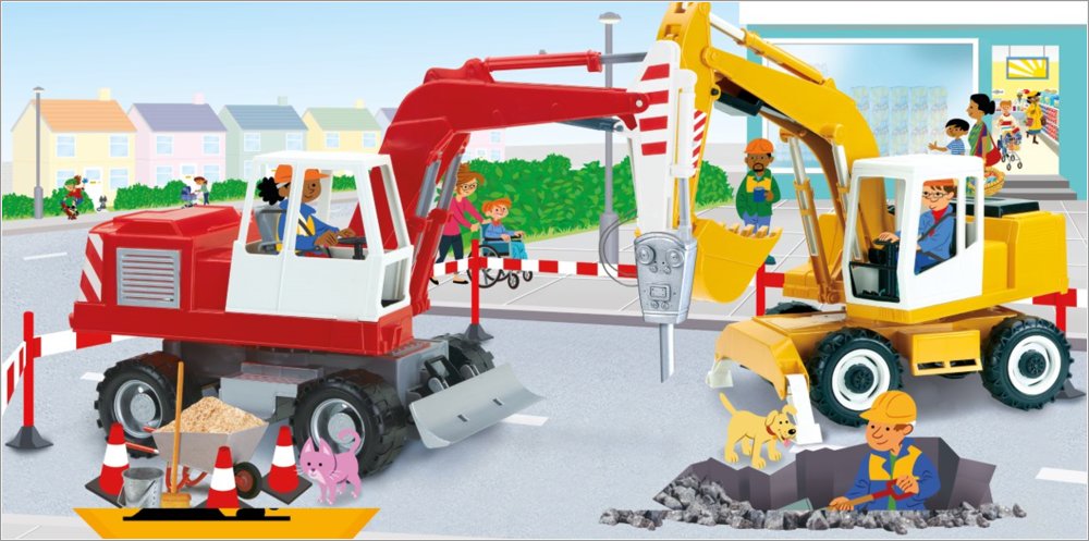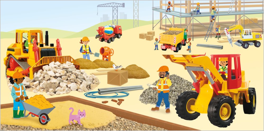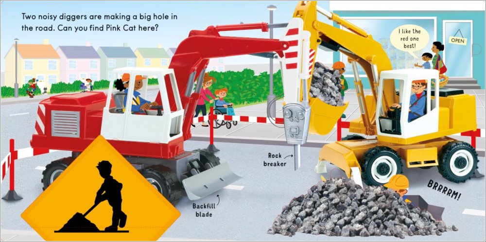 Little hands can lift the big flaps in this robust board book to find out what all the diggers are doing at the building site, on the farm, at the quarry and on the road. On every spread, there’s also a pink cat to look for, lots of things to spot and talk about, and a few hidden surprises along the way.