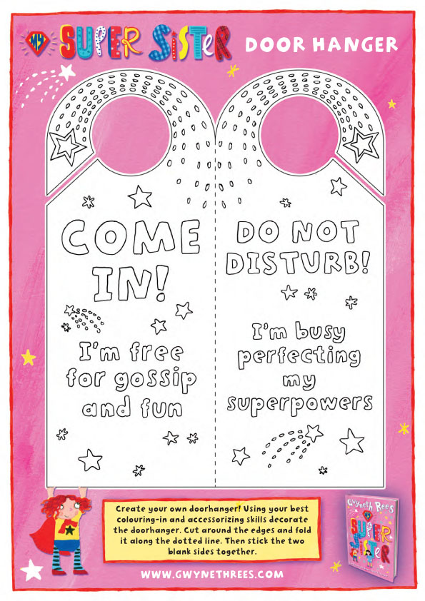 Use your best colouring and accessorising skills to create your own My Super Sister doorhanger.